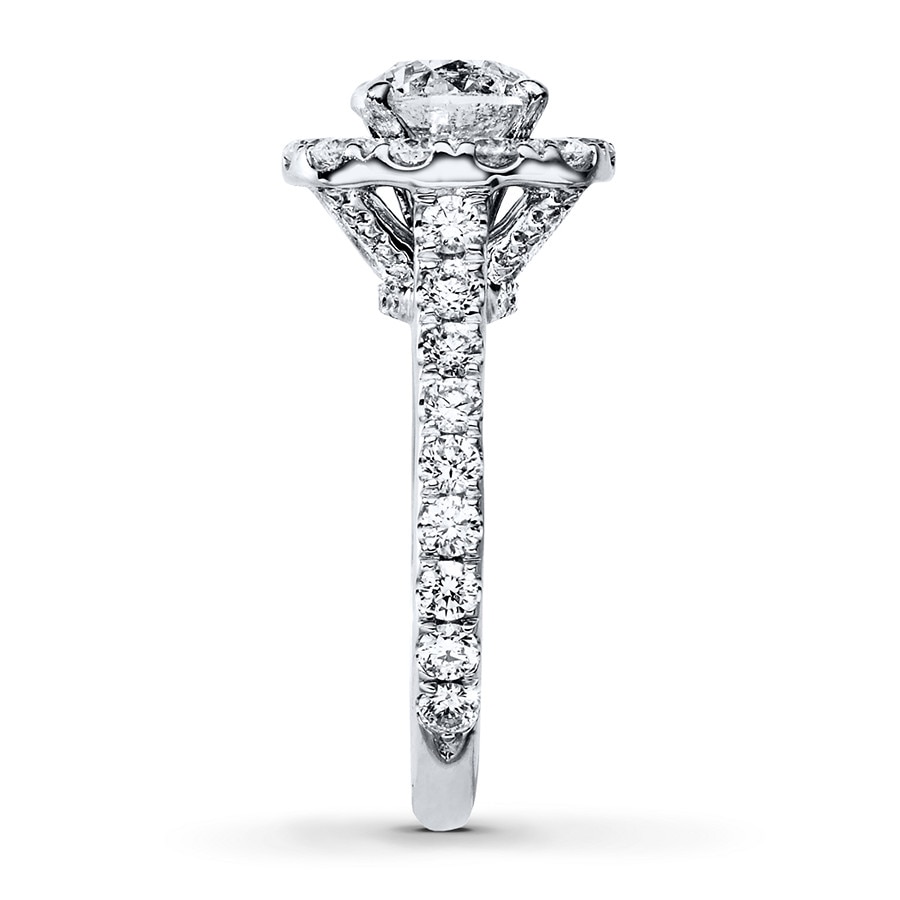 This thrilling engagement ring is complete with an awe-inspiring 1 1/2 carat round diamond framed in additional round diamonds. The band of the engagement ring is adorned in even more round diamonds for a captivating overall design. Crafted of 14K white gold, the engagement ring has a total diamond weight of 2 3/4 carats.