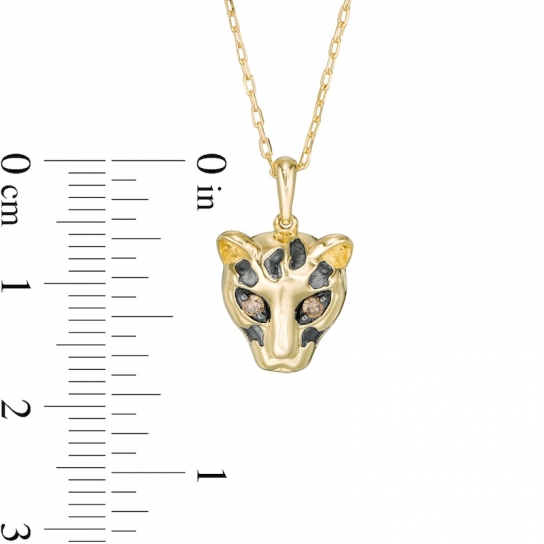 Representing the Super-Villain Cheetah, this diamond pendant captures your fearless spirit. Crafted in warm 10K gold and black rhodium plate, this choice showcases a sculpted cheetah head adorned with alluring champagne diamond eyes and a spot design in black rhodium. Radiant with 1/20 ct. t.w. of diamonds and a brilliant buffed luster, this pendant suspends along an 18.0-inch cable chain, with an additional closure ring at 16.0 inches, that secures with a spring-ring clasp. This exclusive fine jewelry collection inspires you to wear your strength, confidence and power.