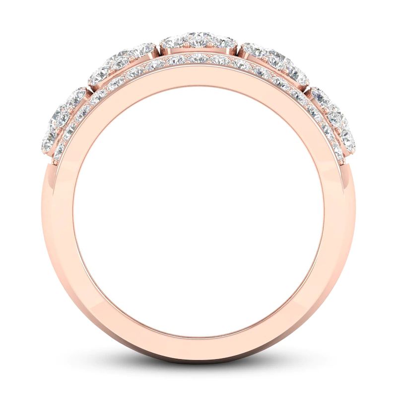 Clusters of dazzling round diamonds adorn the center band of this elegant women’s ring. Even more brilliant round diamonds border above and below the center to complete the look. Fashioned in 14K rose gold, the total diamond weight of the ring is 1 1/5 carats.