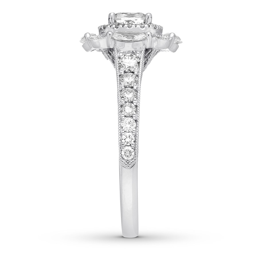 Combining vintage-inspired design with modern details, this remarkable engagement ring from displays a 3/4-carat cushion-cut diamond center framed in round diamonds. Marquise diamonds pair with duets of round diamonds to create the sparkling outer frame. Delicate milgrain and shimmering diamonds adorn the band to complement. Fashioned in polished 14K white gold, the ring has a total diamond weight of 1 5/8 carats.