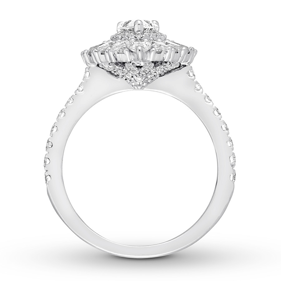This breathtaking Neil Lane Studio engagement ring celebrates the glamour and elegance of the past. The dazzling center showcases a 1/2-carat pear-shaped diamond encircled by round diamonds. A burst of pear, round, and baguette diamonds completes the frame. Styled in polished 14K white gold, the ring has a total diamond weight of 1 7/8 carats.