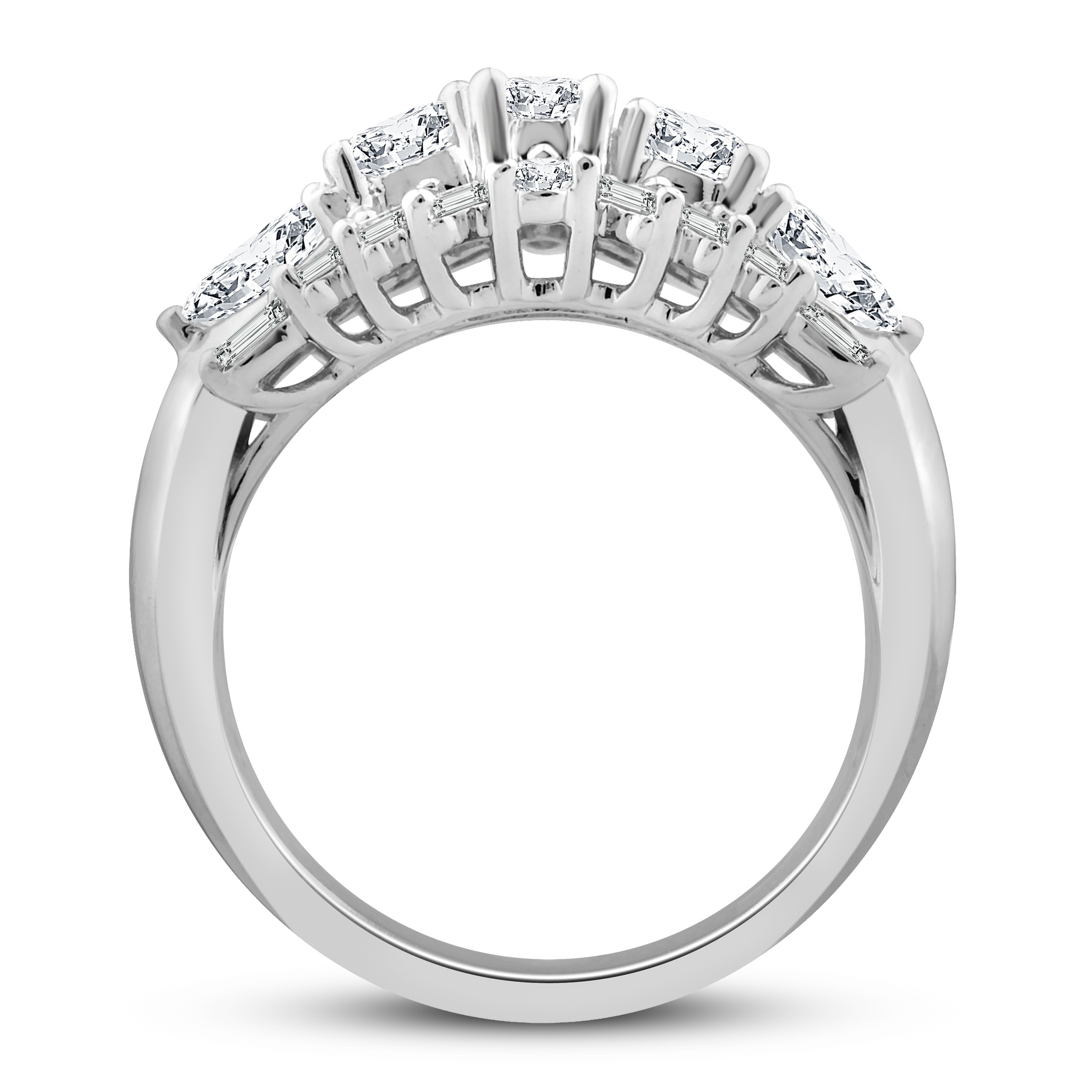 This mesmerizing diamond ring collection features five distinctively-shaped diamonds, symbolic of everything she means to you. Each diamond shape has a different meaning, from integrity and wisdom, to confidence, totality, and elegance. This stunning 10K white gold ring features a pear-shaped, princess-cut, emerald-cut, round-cut and oval-cut diamond set across the center. Sparkling baguette-cut diamonds flank outward above and below, with two brilliant round-cut diamonds finishing the iconic look. The ring has a total diamond weight of 2 carats.